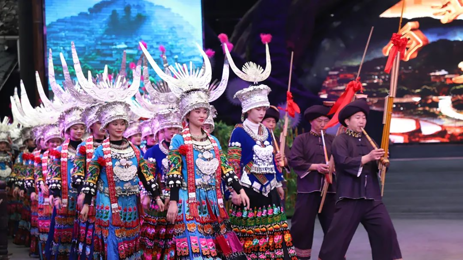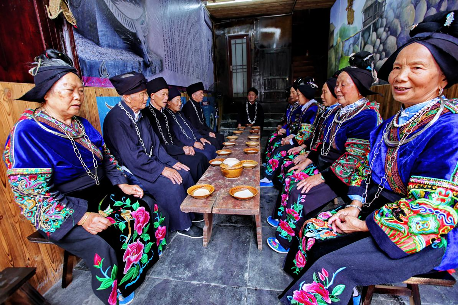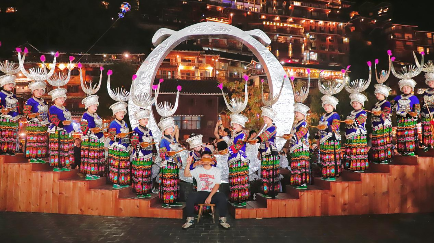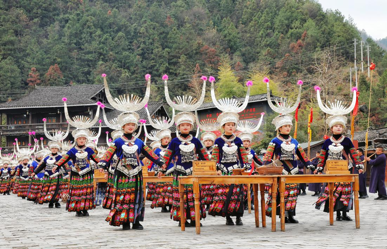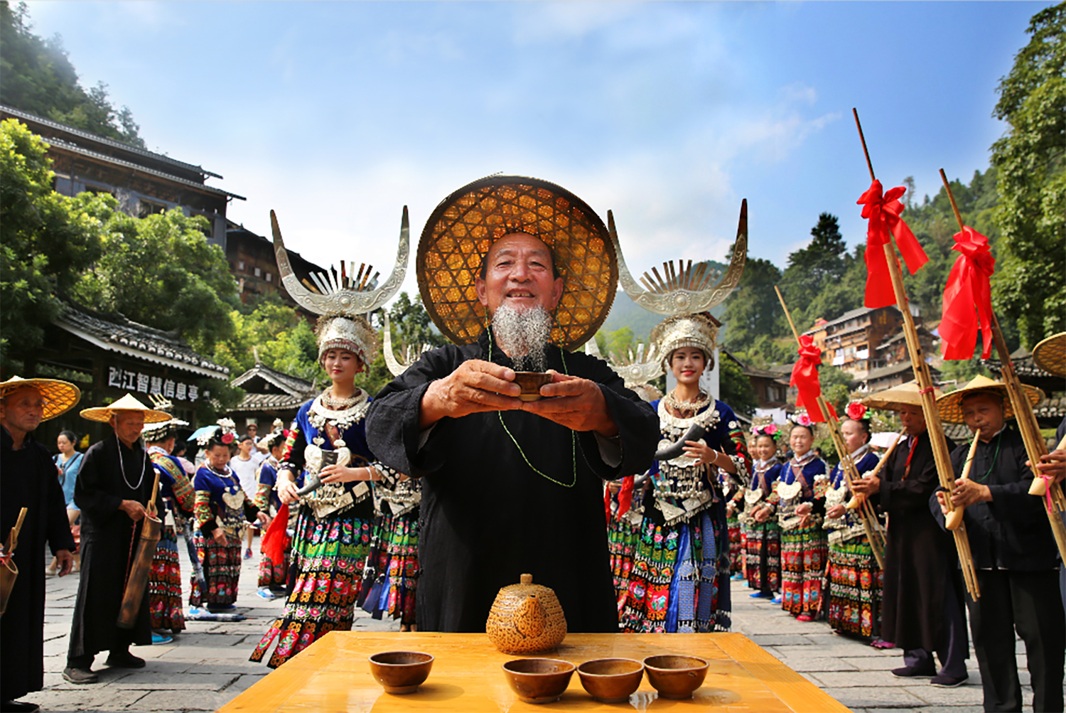 苗族是以酒来表达情感的民族。客人来了必须以美酒相待,是神圣而不可改变的待客礼仪。西江千户苗寨景区北/西门外,苗寨人穿着盛装,摆着十二道迎宾酒,一道一个大智慧,每一道都有丰富的文化内涵,既表达了对客人的美好祝愿,也表达了苗族千百年的传统价值观。