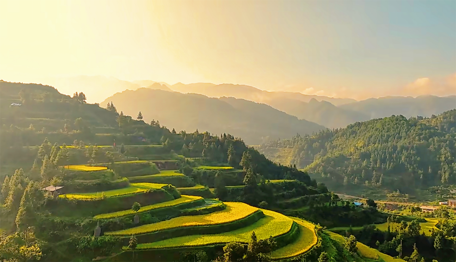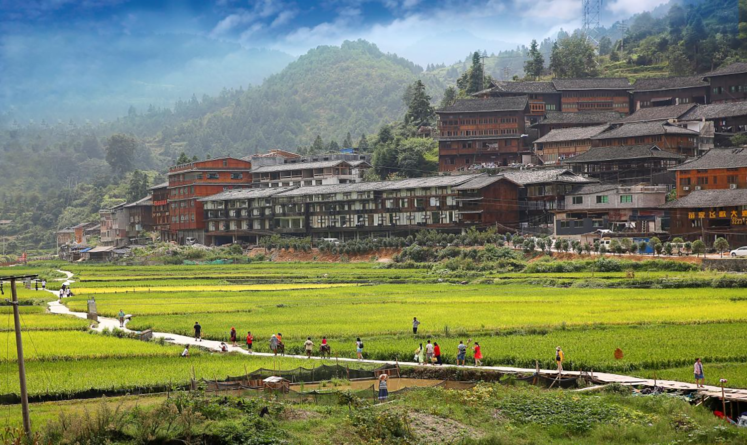 梯田从山脚到山上,一片连着一片,远远望去,巍巍壮观。苗家人还在田里养鱼,鱼儿吃下稻花,养成了稻花鱼,鱼在田里游动,除了杂草,又养肥了水稻。到了收割季节,稻壮鱼肥,家家户户都“鱼稻双收”。 一片片金黄的水稻画与美丽山水互相映衬,也吸引了不少外来游客前来拍照打卡。