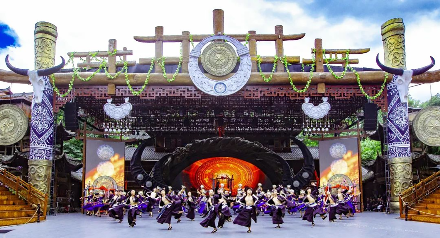 (二)情定西江讨花带。展现了13年一次的鼓藏节祭祀文化、苗族鼓乐,奉献经典舞蹈锦鸡舞、木鼓舞、苗族讨花带等古老文化遗产的优秀演出,被称为跨越千年的文化大赏!共分“请鼓”“祭鼓”“跳鼓”“送鼓”四个篇章,展现出的苗族歌舞,古朴、粗犷、原汁原味的风格,尽情的表达出苗家人的真挚、纯朴。让游客们亲身体验到苗族浪漫的讨花带文化,将西江神秘的苗族原生态文化推向世界,让更多人了解西江、来到西江、爱上西江。